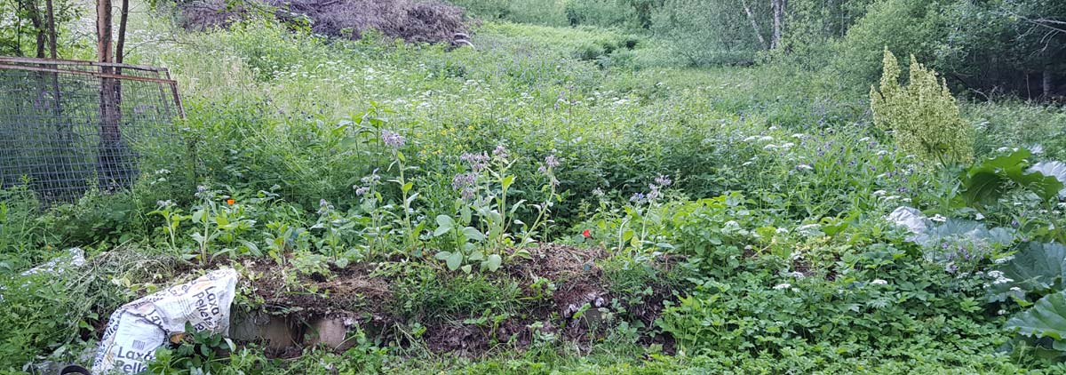 Lite magert blev det nog men gurkörten jag sådde under våren har börjat blomma. Till höger blommar rabarbern stort och fint utan någon som helst skötsel sedan ett antal år tillbaka. Pellestsäckarna återanvänder jag som jordsäckar när jag gräver ur en bädd och gräver ner bokashi eller löv. Då blir det oftast några stycken över som jag kan spara och tömma överst i någon bädd som behöver mer jord, eller vid omplantering utomhud.